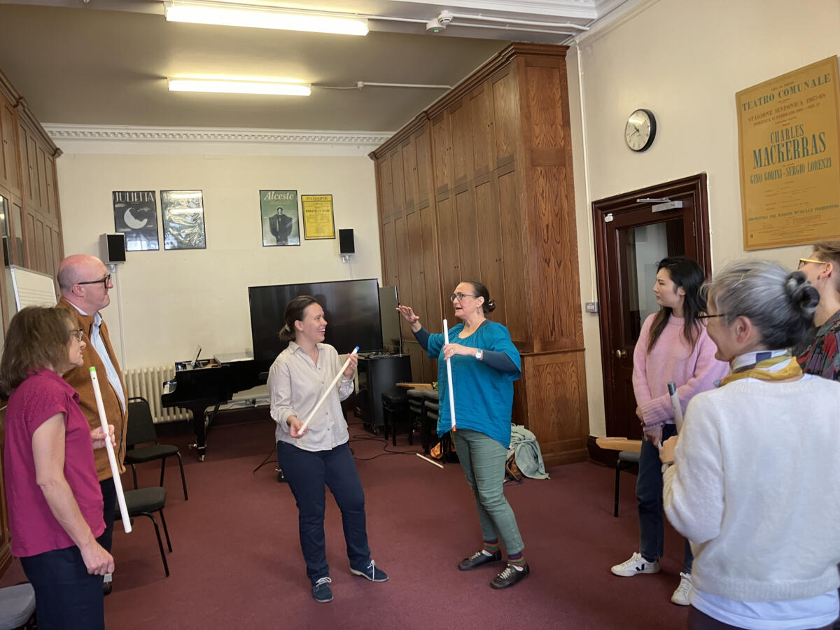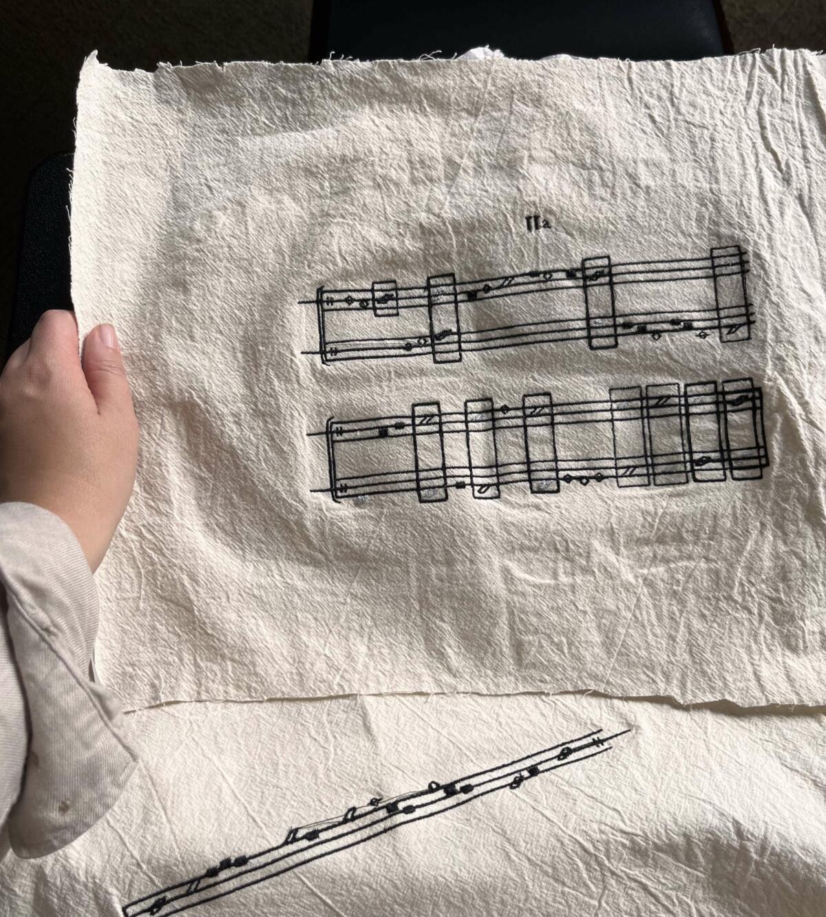 During the Study Day, I held two workshops. The first one focused on testing different notation styles in practice. My interest lies in listening-based music-making, which I am trying to facilitate through notation and other external means, such as various materialities. We concentrated on a notation system I have developed: a three-line staff with relative notation, which can be easily realized regardless of the instruments available. I was delighted that everyone eagerly participated with their voices, even though singing was not their primary instrument (if it was on their list of instruments at all). We also discussed the possibilities and limitations—both practical and mental—that notation can offer, considering what should be notated, how, and why, and how to create accessible or “flexible” music.