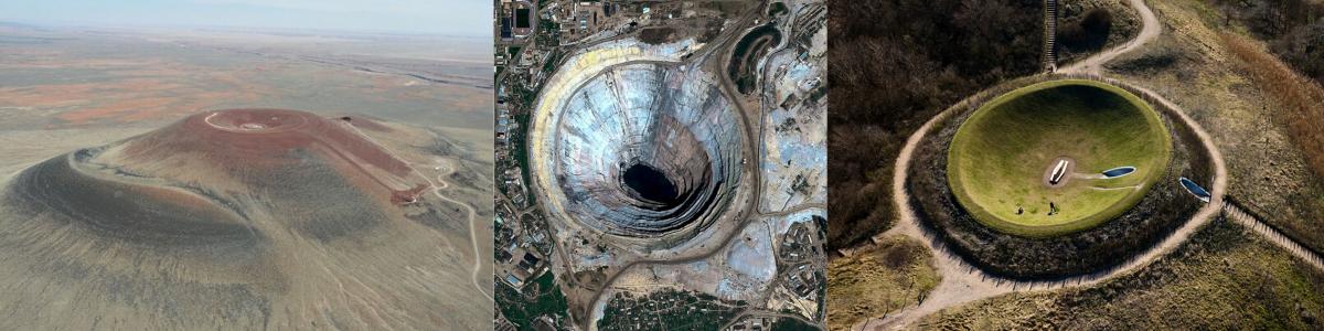 Roden Crater, is a large-scale artwork created within a volcanic cinder cone by artist James Turrell located in Arizona, USA, representing the artist’s lifelong research in the field of human visual and psychological perception. The first major phase of construction included the moving of over 1.3 million cubic yards of earth to create the Crater Bowl and the shaping of the 854′ East Tunnel. The construction on Roden Crater is ongoing. [16] The Mir Mine is an inactive, open-pit diamond mine located in Mirny, Eastern Siberia, Russia. The mine is 525 m deep and has a diameter of 1200m. This makes it one of the largest excavated holes in the world. [17] Celestial Vault was built in 1996 by James Turrell in The Hague, Netherlands. The Celestial Vault is a monumental earthwork constructed to resemble a large crater. The idea is for visitors to lie on the bottom of the work with their heads towards the lower ends of the slopes which will allow them to see the edge of the crater but mainly the open sky. [18] If standing on the edge of Roden Crater, Mir Mine and Celestial Vault how could I make a distinction between these three (or distinct the one from the two) if thinking of them as formalistic sculptures? Or has time passed me by and I’m not allowed to look at them from this perspective?
