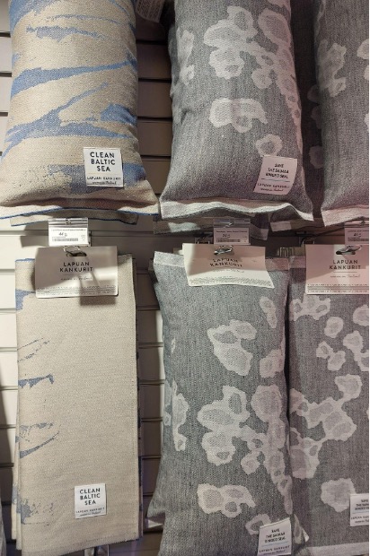 A particular product caught my eye, a collection of towels designed and woven in Finland with the eye-catching slogan ‘Clean Baltic Sea’. How to read this? As a statement of fact, or as a call to action? I had just learned about the algal bloom that occurs in the Baltic Sea around the Helsinki coastline. The situation is so bad that the Finnish Environment Institute has a constantly updating website to show the levels of the “blue-green algae situation” which can change quickly especially during the Summer months as the water warms up. The situation is so dire, they lead with the alarming message: “Summer water is enticing to swim, but the beach water seems to be greening. Do you dare to go swimming?” [1]