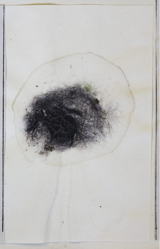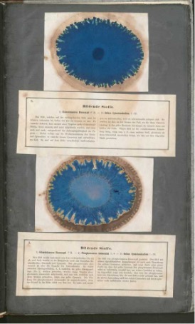 Friedlieb Ferdinand Runge was a German analytical chemist, a friend of Goethe, and best known for his discovery of caffeine. He was interested in the chemistry involved in aspects of everyday domestic life and in turn made sure to make his discoveries accessible to a wide audience, including housewives and children. In 1855, Runge self-published Der Bildungstrieb der Stoffe: veranschaulicht in selbstständig gewachsenen Bildern (The Drive to Formation of Elements: Made Visible in Independently Grown Images), a catalogue of images formed by dropping various of chemicals on blotting paper. He carefully scrutinised the patterns and colourings that formed until he learned through slow observation which combinations gave what effect and colour range. Runge believed his materials had agency. In an echo of Barad’s intra-action, he wrote “the chemical behaviour of an element depends on its chemical activity, and this activity is its peculiar expression of life when confronted by another element.” [14]