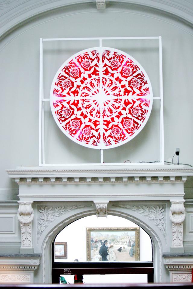 Teoksessa oleva kuvio on läpileikkaus taiteilijan kylpyhuoneesta löytyvistä kaunistautumisesineistä, kuten hammasharjoista, pumpulipuikoista, parfyymipullosta, saksista ja hiustenkuivaajasta. Taustalla oli valo, joka syttyi ja sammui Loosin ääneen luetun ”Ornament and Crime” -esseen ääniaaltojen vaihteluun.