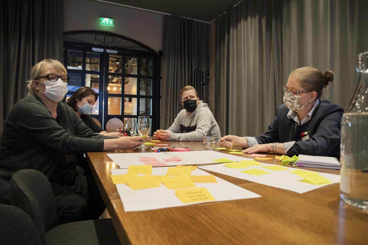 Työpajat fasilitoinut Kunnola sovelsi kuitenkin jokaista työpajaa ennakkotehtävistä saatujen vastausten ja pohjatietojen perusteella. Osassa työpajoista ehdittiin toteuttamaan myös nopea valokuvaustehtävä, jossa haettiin tulokulmaa yrityksen haasteisiin kuvallisin keinoin. Kuvaamiseen käytettiin osallistujien omia matkapuhelimia. Yksi työpajoista pidettiin hybridimallina, jossa yksi osallistujista oli etäyhteyden päässä. Työpajamalli soveltui hyvin myös tämänkaltaiseen sähköiseen työskentelyyn.