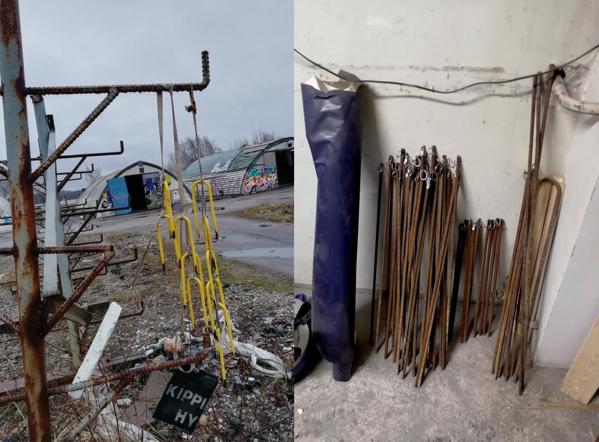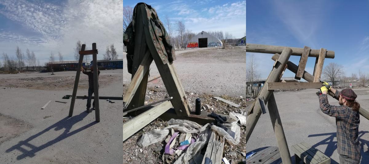 Yhteistyö ulkosalla on hauskaa ja yllättävän joutuisaa. Jokainen retki jättömaalle on erilainen, sillä se on aina muutoksessa. Koska emme raahaa kaikkea keräämämme heti talteen, myös meidän apajillamme on käyty. Ruosteinen tynnyri on lähtenyt kävelemään. Keräilyn lomassa rakennetaan yhdessä aamupäivässä hylätyistä sähkötolpista hirven prototyyppi, joka kestää kasassa muutaman päivän. On mahdotonta sanoa, onko se kaatunut tuulessa itsessään vai onko ohikulkija päättänyt potkaista sen kumoon. Etukäteen on hankala hahmottaa miltä jättömaalla kuviteltu ja kasattu hirvi tulee lopulta näyttämään seisoskellessaan harjun päällä metsän siimeksessä. Miten erilaisen luonteen ja roolin saavat kaikki rakennustyömaiden hylätyt rojut, joita pikkuhiljaa kasautuu protohirven ympärille? Näistä syntyy toinen puoli teosta, hirvirakennelman staattisuutta haastava elementti. Tarkoitus on ripustaa hirven selkään aimo lasti romurautaa. Kilkkeitä, tankoja ja hihnoja, jotka vapaasti killuessaan ottaisivat tuulta alleen ja toivoaksemme tuottaisivat ympäristöön ääntä. Näin toteutuisi hirven toismaailmallinen puoli, luonnonvoimien ajatus rakennelman takana. Tämäkin epämääräinen muuttuva elementti jännittää, sillä tuulessa killuvat hakaset tuottavat vain vaivoin ääntä kilahdellessaan laiskasti toisiaan vasten. Onneksi en ole yksin tuntoineni, sillä huojentavin aspekti näin ison työn äärellä on lopulta vahva luottamus yhteistyöhön ja kommunikaatio kaikissa vaiheissa. Kyl tää tästä!