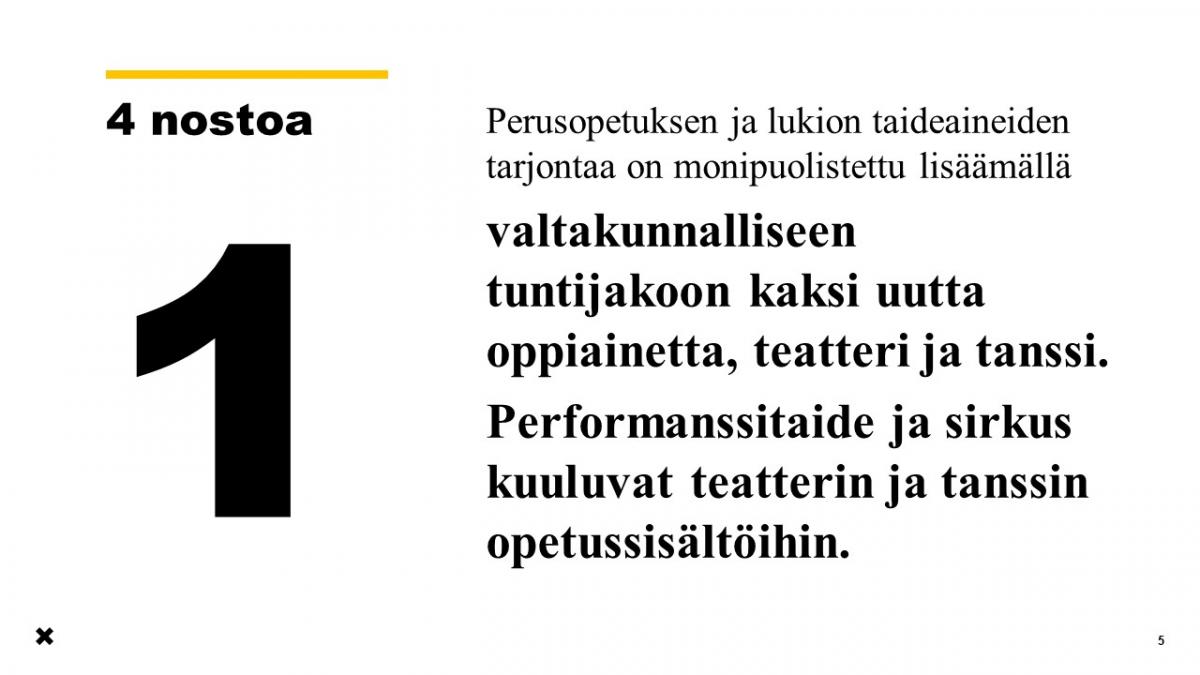 Esitämme, että teatteri ja tanssi sisällytetään peruskoulun ja lukion valtakunnalliseen tuntijakoon itsenäisiksi oppiaineiksi musiikin ja kuvataiteen rinnalle monipuolistamaan yleissivistävän koulutuksen taideaineiden opetusta.