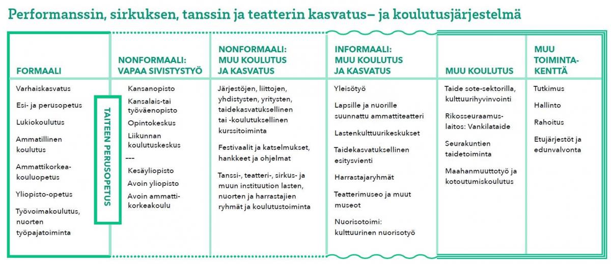 Hankkeen ensimmäinen tehtävä oli selvittää esittävien taiteiden kasvatuksen ja koulutuksen ekosysteemi. Alusta saakka oli varsin selvää, että esittävien taiteiden koulutusjärjestelmä on laajempi kuin formaalin koulutuksen järjestelmä, johon sanalla yleensä viitataan.
