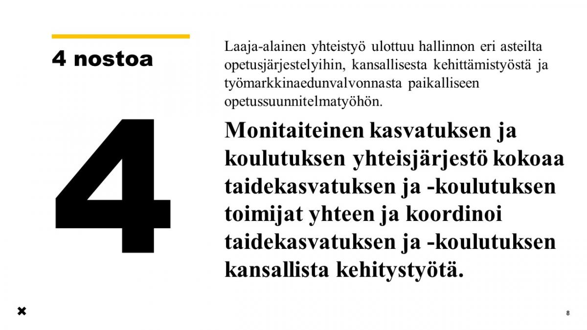 Näissä kaikissa visiotöissä on otettu askeleita eri toimijoiden väliselle yhteistyölle niin alueellisesti kuin valtakunnallisesti. Tässä suunnassa askeleita on syytä ottaa lisää, ja yksi ehdotus tähän suuntaan on monitaiteinen kasvatuksen ja koulutuksen yhteisjärjestö, joka kokoaisi taidekasvatuksen ja -koulutuksen toimijat yhteen ja koordinoisi taidekasvatuksen ja -koulutuksen kansallista kehittämistyötä.