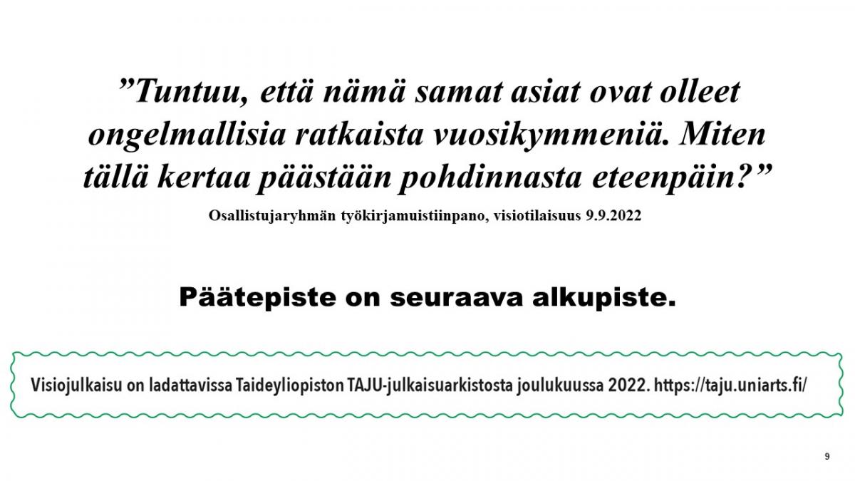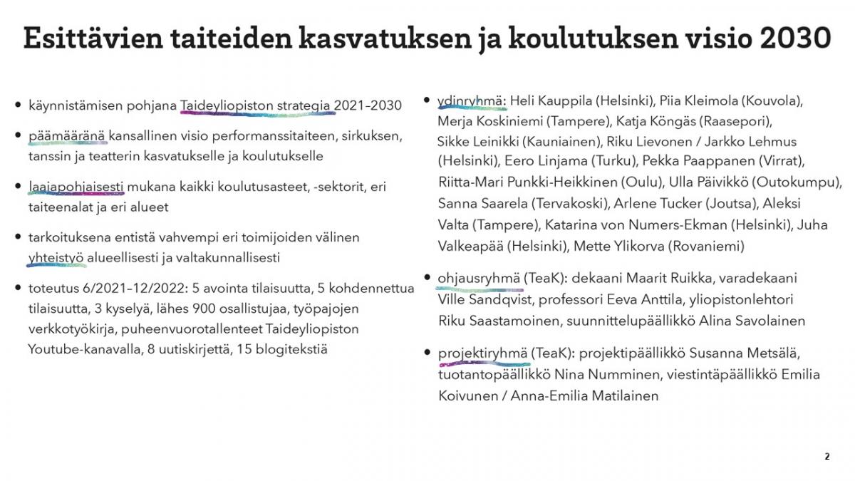 Visiotyö on Taideyliopiston strategiassa vuodelle 2030 määritelty toimenpide. Taideyliopisto on rahoittanut ja koordinoinut tämän hankkeen. Näkökulma on ollut kansallinen ja kutsut osallistua avoimiin tilaisuuksiin ja kyselyihin on toteutettu laajapohjaisesti. Laajapohjaisuutta työhön on tuonut myös 16-jäseninen ydinryhmä – joskin ydinryhmänkään kokoonpano ei kata koko kentän moninaisuutta. Hanke on tavoittanut lähes 900 osallistujaa kuluneen vuoden aikana ja edelleen uusia uutiskirjeen tilauksia ja suoria yhteydenottoja tulee joka viikko. Hanke tavoitti monia ja monet eivät ennättäneet tästä kuullakaan. Hanketta on ohjannut 5-jäseninen ohjausryhmä, ja lisäksi hankkeen käytännön toteutuksessa on ollut mukana projektiryhmä. Rinnalla kulkenut kuvataidekoulutuksen ja -kasvatuksen visiotyö on ollut tärkeä tuki ja erityisesti kollegani Katriina Rosavaara. Tahdon jo tässä vaiheessa esittää suuret kiitokset teille kaikille sekä kaikkien tapahtumien järjestäjille ja puhujille.