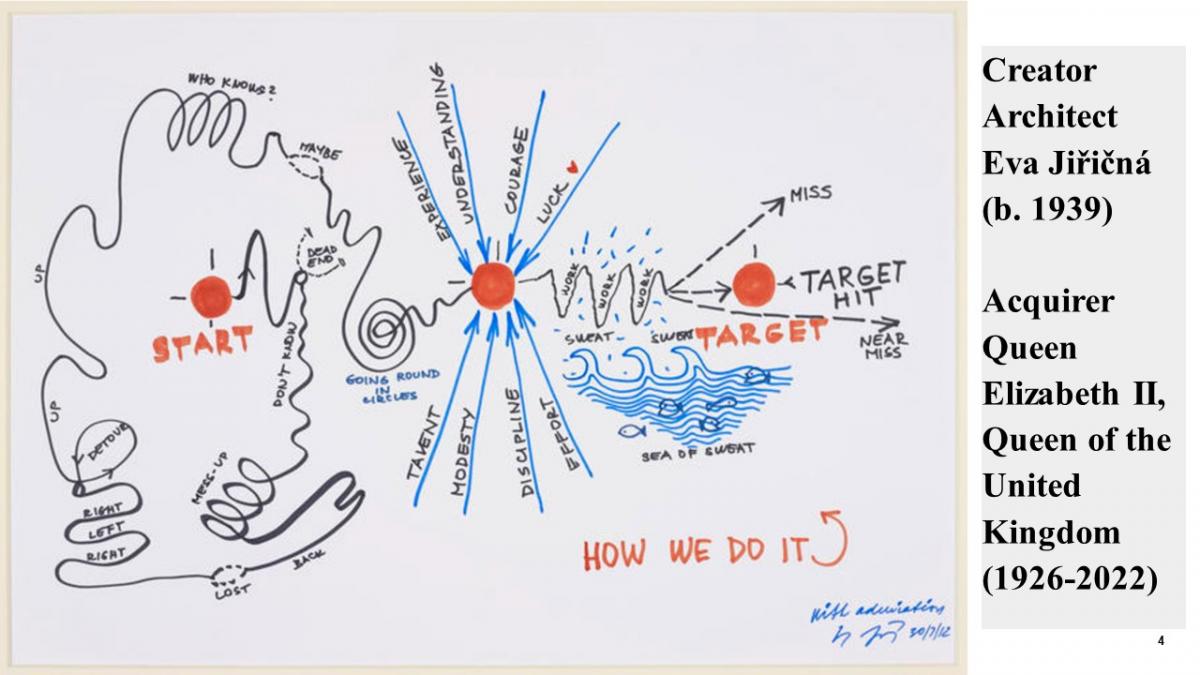 Tämän projektin visualisoinnin on piirtänyt tsekkiläinen arkkitehti Eva Jiřičná. Tämä ei kuvaa visiohanketta suoraan. Visiohankkeessa ensinnäkin olisi punaisia täpliä enemmän osoittamassa viittä avointa seminaaria ja viittä kohdennettua työpajaa. Tahdon kuitenkin näyttää tämän projektikuvan tässä tilaisuudessa siksi, että se tavoittaa luovan projektin ja prosessin tavanomaisia projektikaavioita todenmukaisemmin.