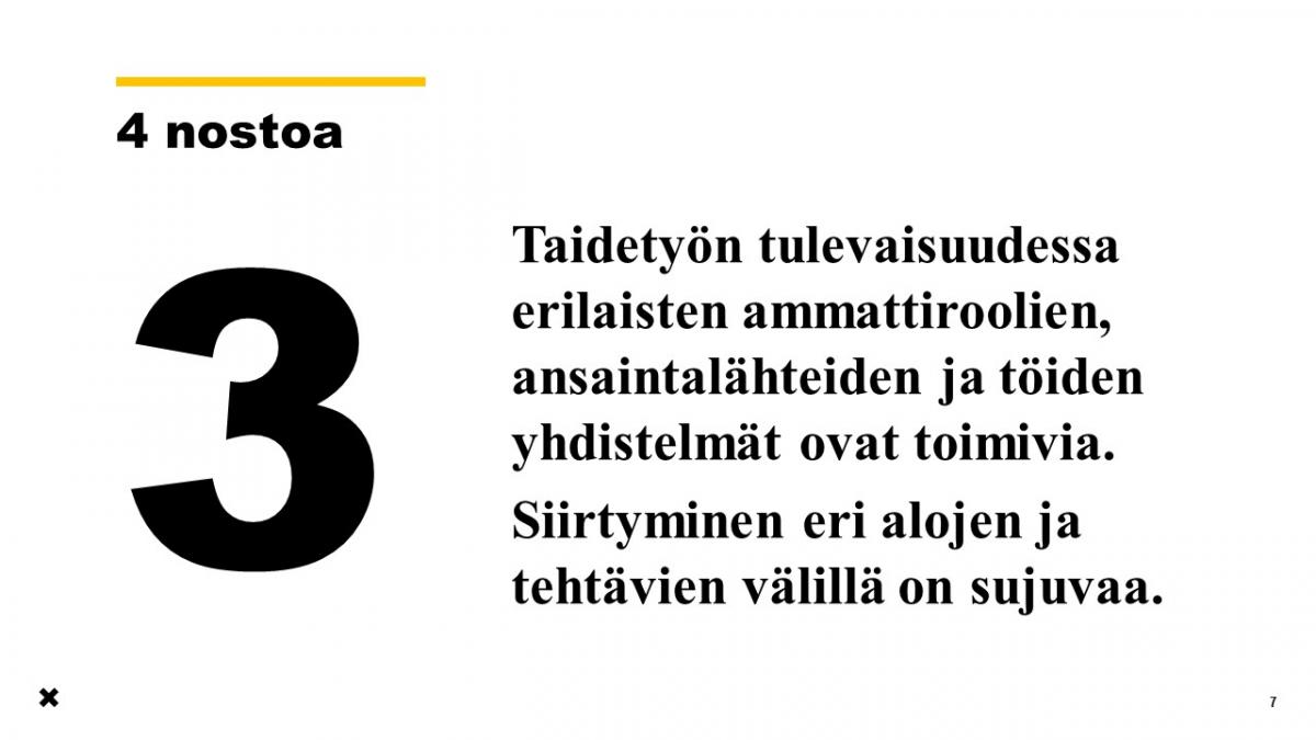 Jo nykyisellään taiteilijan tai taideopettajan työnkuva voi koostua esimerkiksi taiteellisesta työstä, opettamisesta, kouluttamisesta, tuottamisesta ja hallinnosta samanaikaisesti tai ajallisesti peräkkäin. Ansainta voi muodostua palkkatyöstä työ- tai virkasuhteisena useassa organisaatiossa samanaikaisesti, yritystulosta, erilaisista palkkioista, tekijänoikeuskorvauksista ja apurahoista. Näiden ammattiroolien, ansaintalähteiden ja töiden yhdistelmien täytyy olla toimivia ja siirtymisen eri tehtävien ja alojen välillä olla sujuvaa.