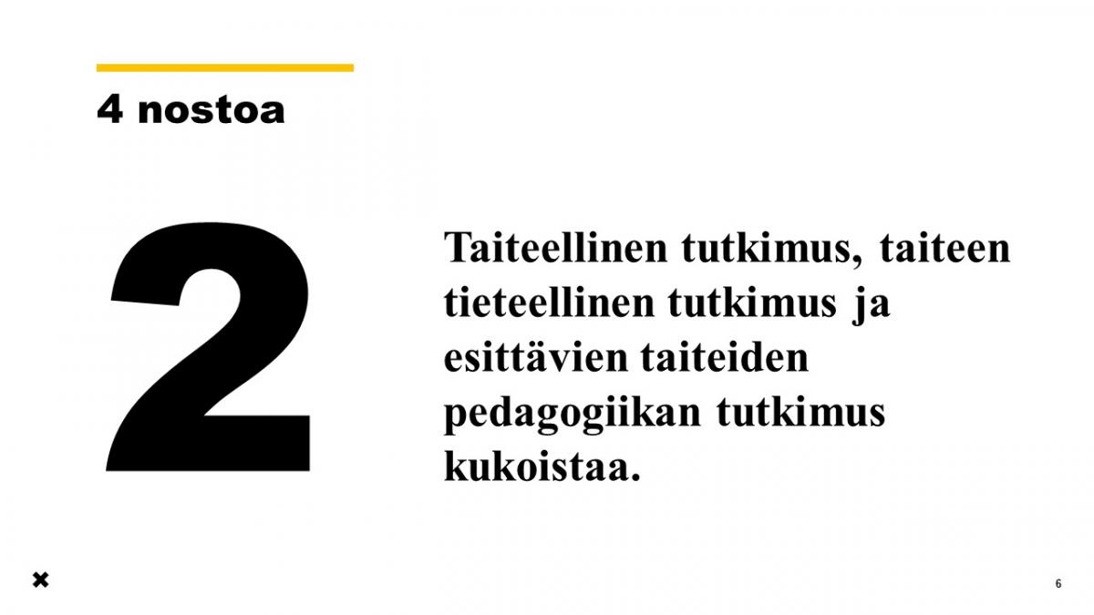 Vuonna 2030 Esittävien taiteiden tutkimus on runsasta, monipuolista ja vaikuttavaa. Taiteellinen tutkimus, taiteen tutkimus ja esittävien taiteiden pedagogiikan tutkimus kukoistaa.