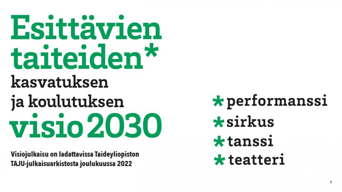 Olen Susanna Metsälä, Esittävien taiteiden kasvatuksen ja koulutuksen visio 2030 -hankkeen projektipäällikkö. Julkistan tänään performanssin, sirkuksen, tanssin ja teatterin vision tiivistelmän. Visiojulkaisu kokonaisuudessaan valmistuu joulukuun puolivälissä.