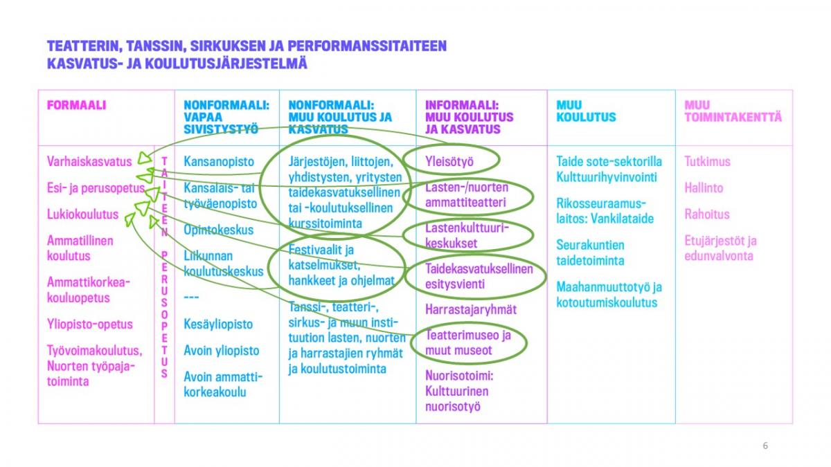 Tosiasiassa näiden toimintojen merkitys ulottuu pelkkää tukemista pidemmälle. Taiteiden saatavuuden edistämiseksi toimivat tahot ja toimintamallit paikkaavat varhaiskasvatuksen ja yleissivistävän koulun taideopetuksen aukkoja. Teatterin, tanssin, sirkuksen ja performanssitaiteen osalta taidekasvatus voi olla muutamia poikkeuksia lukuun ottamatta jopa kokonaan näiden tahojen varassa.