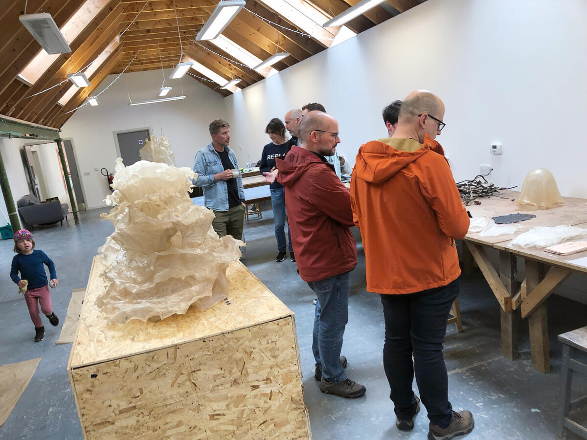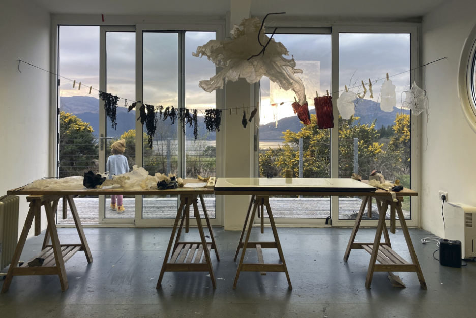 Residenssin kuluessa keskityin tutkimaan materiaaleja, jotka ovat biohajoavia, myrkyttömiä ja joiden tuotannossa on huomioitu niiden ekologinen kestävyys. Työskentelyssäni keskityin levästä valmistettuihin biomuoveihin ja niiden hyödyntämiseen taiteeni tekemisessä. Residenssijakso tarjosi kestävyyden pohtimista ja harjoittelua myös toisenlaisessa kontekstissa: perheellisen taiteilijan omassa sosiaalisessa ekosysteemissä. Residenssityöskentely antoi uusia näkökulmia siihen, kuinka lapsiperhearki ja taiteen tekeminen voidaan sovittaa yhteen kestävällä tavalla.