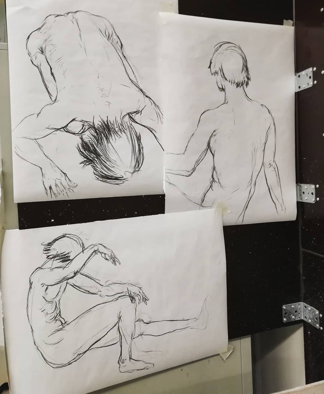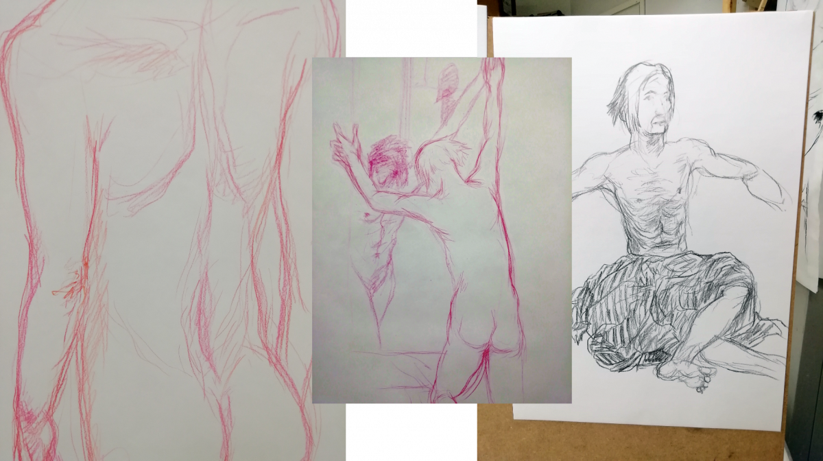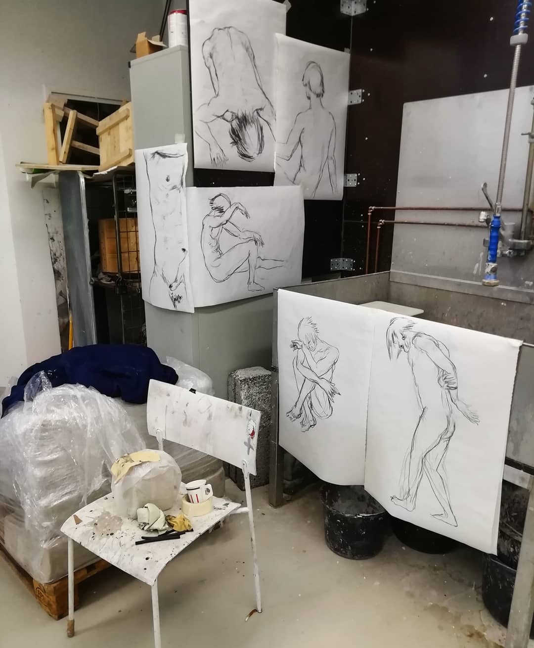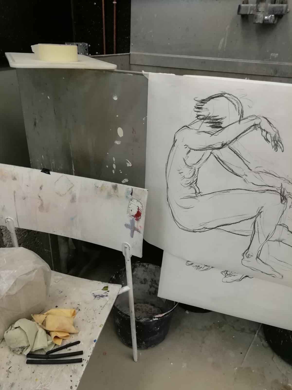 Mahdun helposti mukaan, sillä piirtäjiä on aamupäivästä paikalla kolme. Otan oman tutun paikkani vesipisteen vierestä ja mietin montako kuukautta on kulunut edellisestä kerrasta. Tuntuu ruhtinaalliselta päästä tänne, tässä tilanteessa. Ennen kaikkea pääni tyhjenee kuin itsestään sormieni tartuttua hiileen.