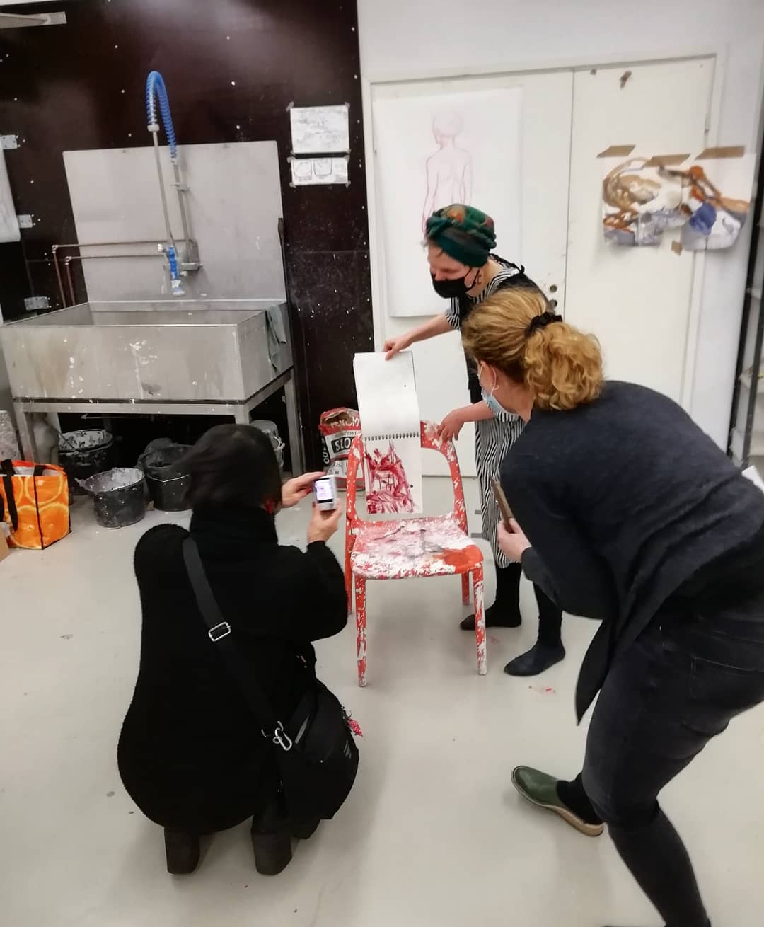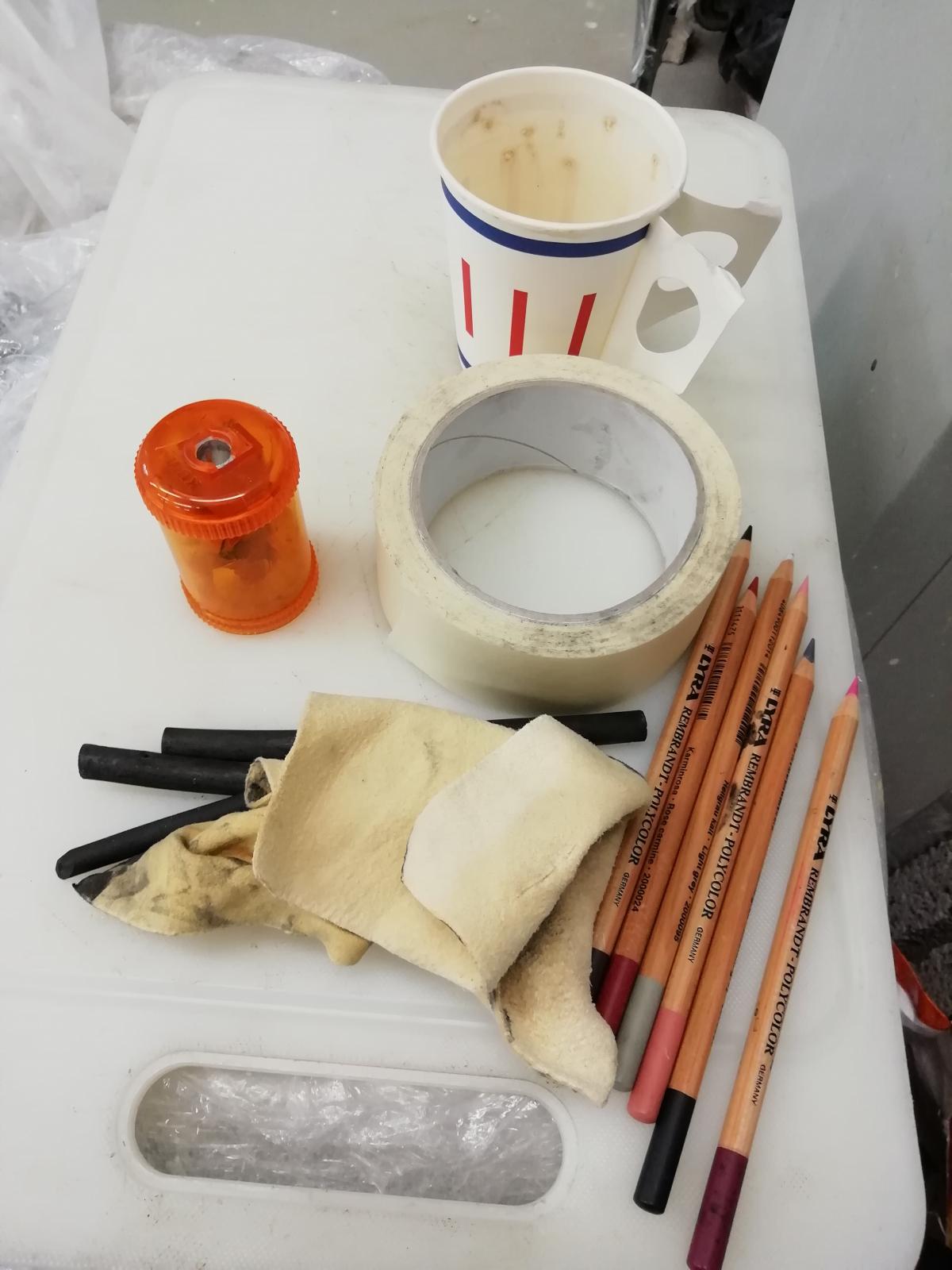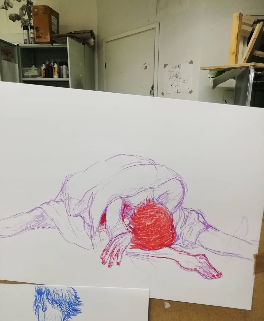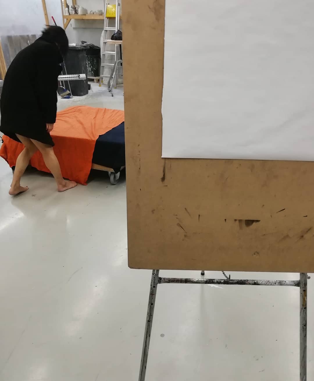 Mahdun helposti mukaan, sillä piirtäjiä on aamupäivästä paikalla kolme. Otan oman tutun paikkani vesipisteen vierestä ja mietin montako kuukautta on kulunut edellisestä kerrasta. Tuntuu ruhtinaalliselta päästä tänne, tässä tilanteessa. Ennen kaikkea pääni tyhjenee kuin itsestään sormieni tartuttua hiileen.