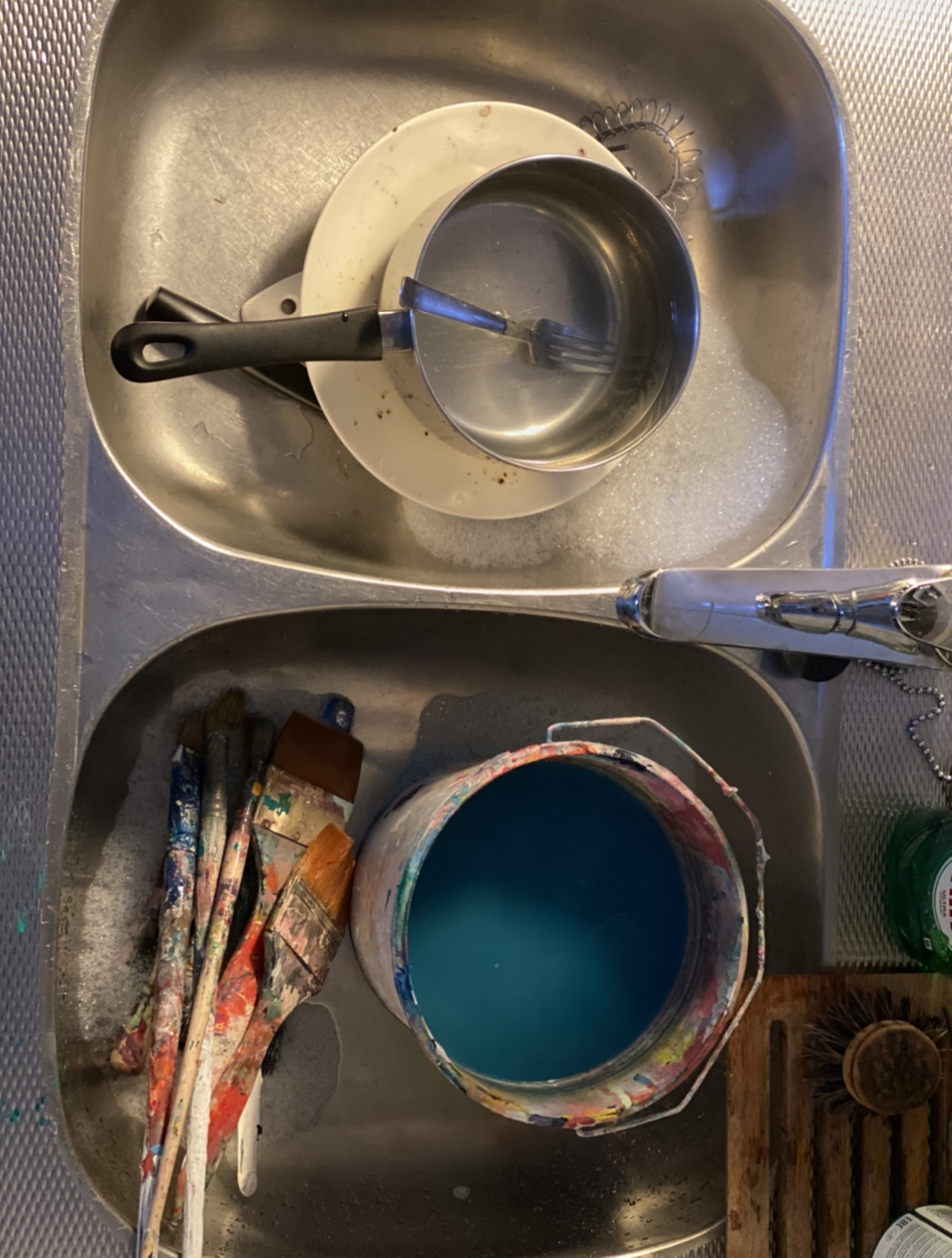 I moved to Home less than two weeks ago. Now I’ve transformed the space into a new playground. Mr. Living room is dressed up in plastic protection, Mrs. Kitchen cooperates and shares the sink with these cricket bats dipped with the brush…