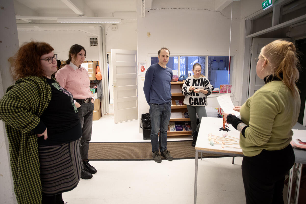 Taiteilija-fasilitaattori Maire Karuvuori ohjasi taiteilijoiden työskentelyä erilaisin osallistavin menetelmin. Ja viikon loppupuolella taiteilijat testasivat ideoitaan toisillaan ja saivat Karuvuoren ohjaaman palautemenetelmän myötä rakentavaa palautetta ideoistaan.