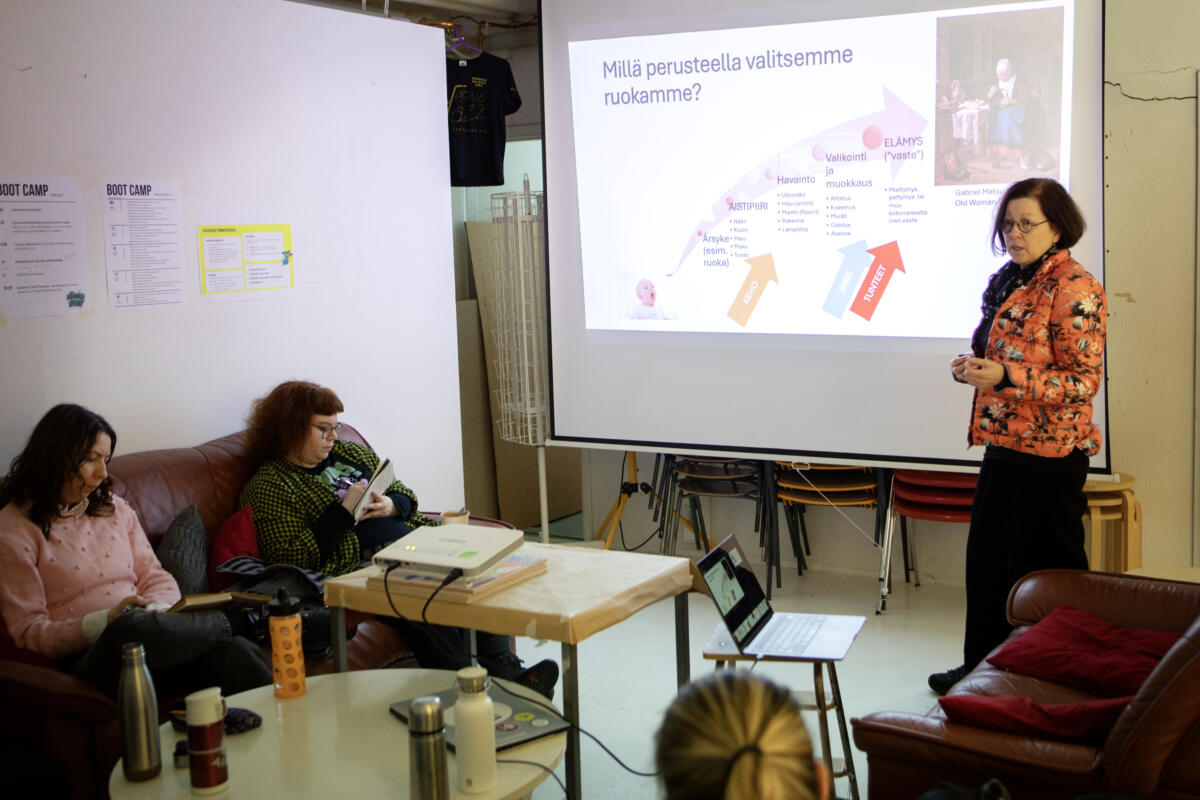 Turun yliopiston Anu Hopia kertoi taiteilija-asiantuntijoille moniaistisuudesta ja siitä, mitkä muut asiat kuin ruoan maku vaikuttavat sen menekkiin. Tärkeää tietoa taiteilijat saivat myös yhteiskoulun oppilailta, opettajilta ja muulta henkilökunnalta.